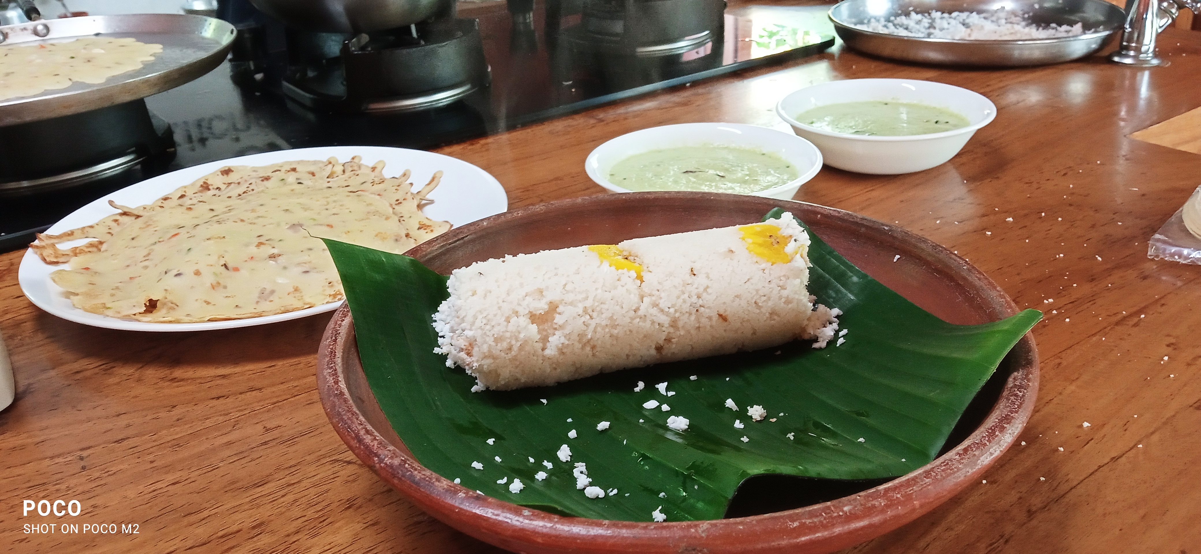 Awaiting you is a breakfast that feels like a warm embrace—steaming puttu served with ripe bananas and spiced kadala curry, paper-thin dosas with tangy sambar and coconut chutney, and a fragrant bowl of upma made with roasted semolina and vegetables, all lovingly prepared in our kitchen. Freshly squeezed juice sits beside your plate, followed by a cup of hot tea brewed in true Kerala style.